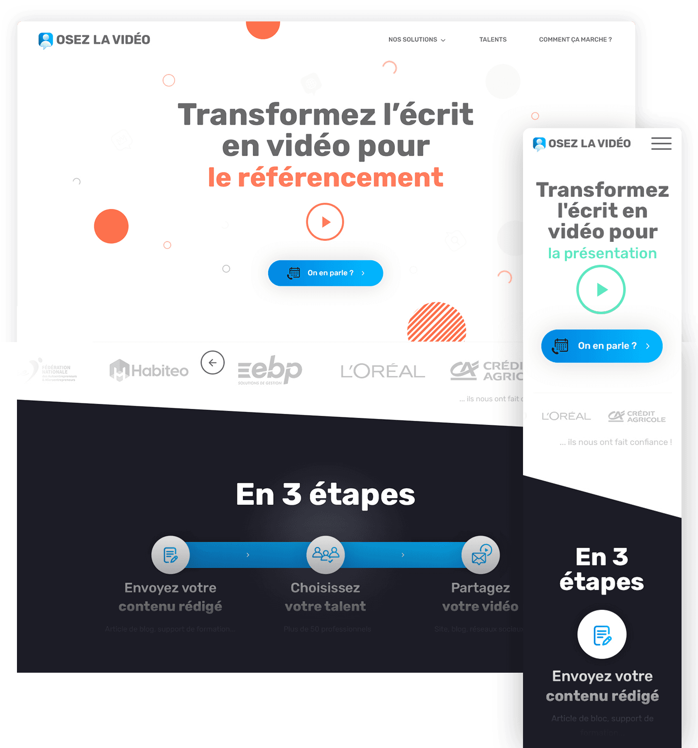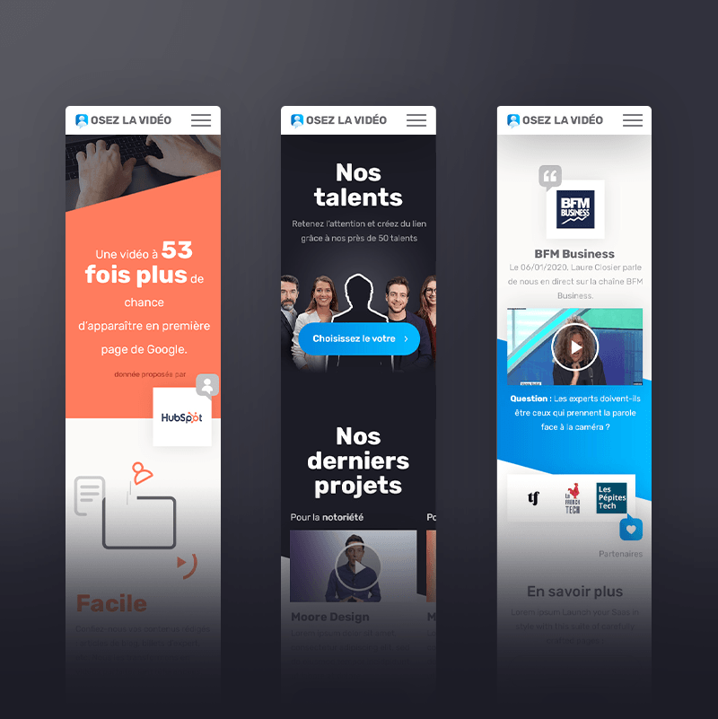 Le site a entièrement été adapté et optimisé pour les mobilesLorsqu'on prospecte via les réseaux sociaux, il faut soigner la version mobile de son site. Sachant qu'Osez la Vidéo souhaite se démarquer par le dynamisme et l'aspect pétillant de son site, nous avons optimisé et soigné l'affichage sur les périphériques connectés.