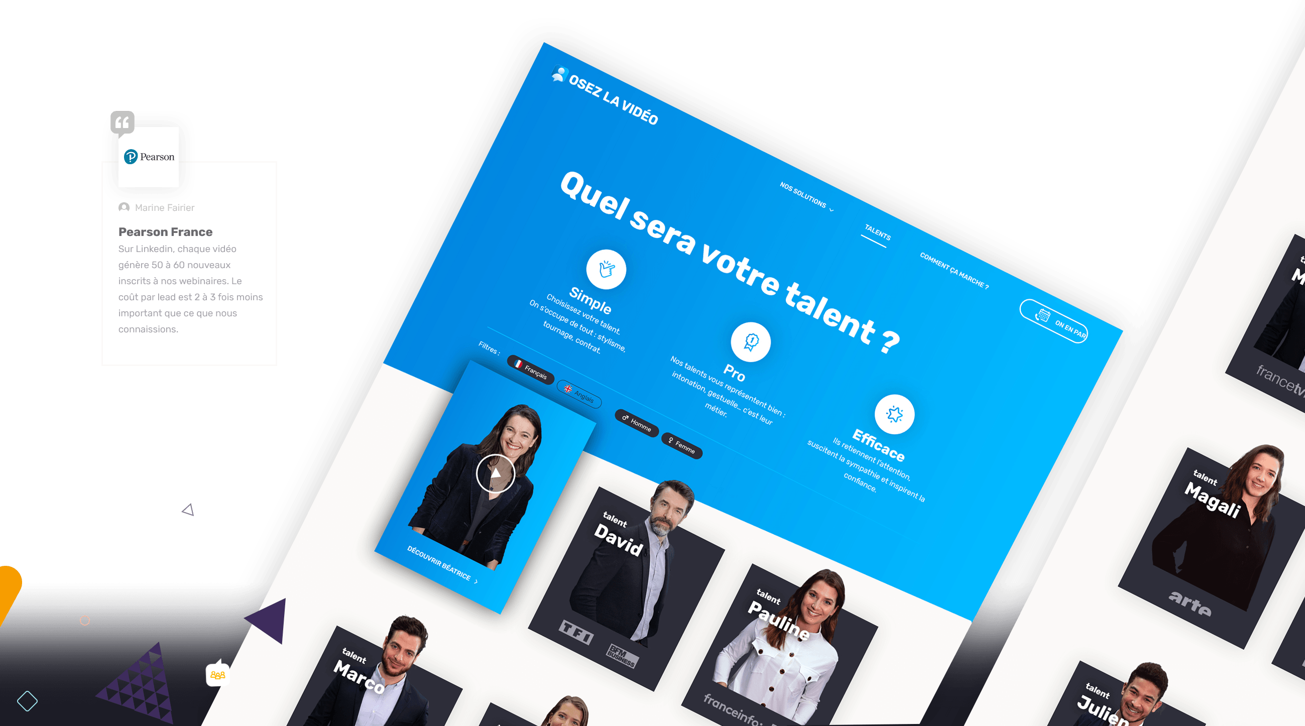 ... et avec un catalogue interactifOsez la Vidéo travaille avec près de 50 talents expérimentés : comédiens, journalistes et animateurs. La mise en place du catalogue interactif a permis de les référencer et d'inciter le prospect à se projeter dans la présentation de sa future vidéo.